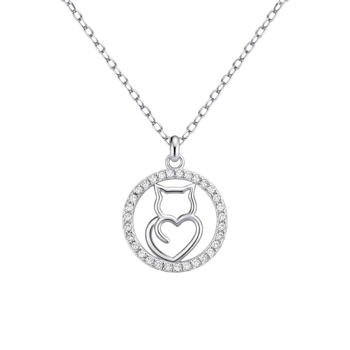 Това колие е изработено от сребро проба 925 с родиево покритие. Централният елемент представлява кръгъл медальон, в който е разположен нежен силует на коте. Опашката на животното е извита така, че да образува перфектно сърце, символизиращо привързаност и любов. Целият медальон е обгърнат от фин ореол от множество искрящи камъни, които добавят сияние и завършеност на композицията. Всички цирконии са с шлифовка тип брилянт.