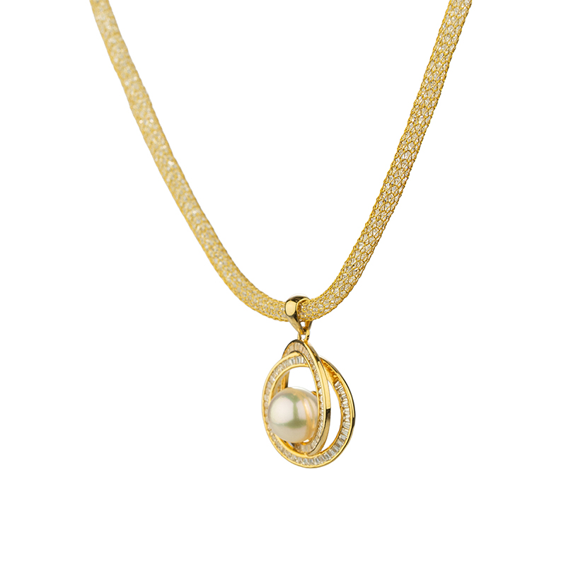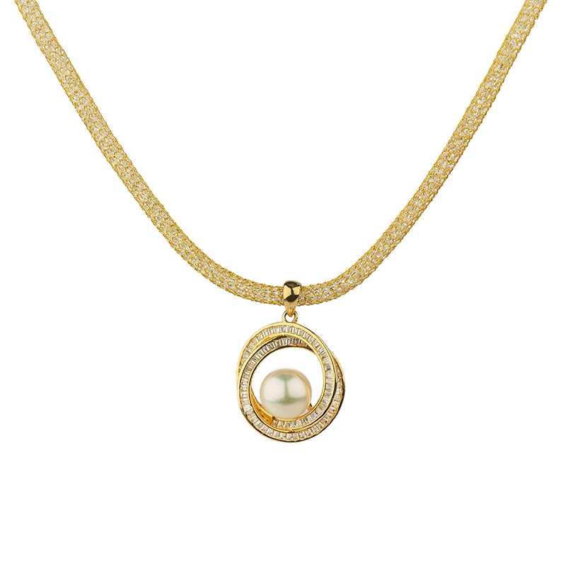 Това колие е изработено от сребро проба 925 с 3 микрона покритие от 14-каратово жълто злато. Синджирът представлява фина сребърна мрежа с цирконий, която придава допълнителен блясък. Дизайнът на висулката се отличава с елегантна композиция от концентрични окръжности, декорирани с прецизно подредени камъни, които деликатно обгръщат централната перла и подчертават нейното естествено сияние.