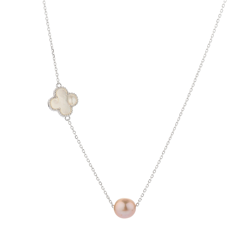 Елегантно колие, изработено от родирано сребро и красива розова сладководна перла. Перлата е със сферична форма и размер 7 - 7.5 мм. Нежен акцент на колието е цветето, на което е инкрустиран естествен седеф, преливащ в розови и бели цветове.