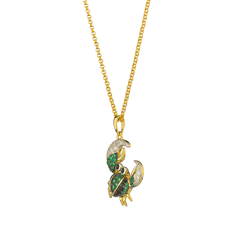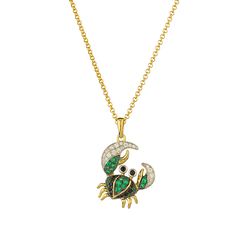 Това сребърно колие с 3 микрона 14-каратово златно покритие е създадено за родените под знака на зодия Рак. Висулката е фино изработена с детайлна зодиакална символика, подчертаваща силата и мистичната природа на този знак.