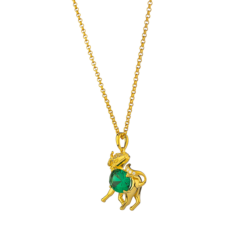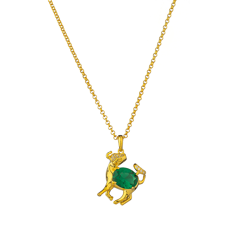 Сребърно колие със зодиакалния знак Телец, на което са инкрустирани синтетичен зелен шпинел и малки циркониеви камъчета.