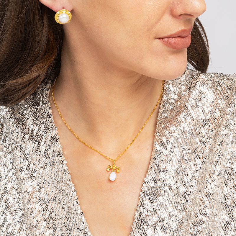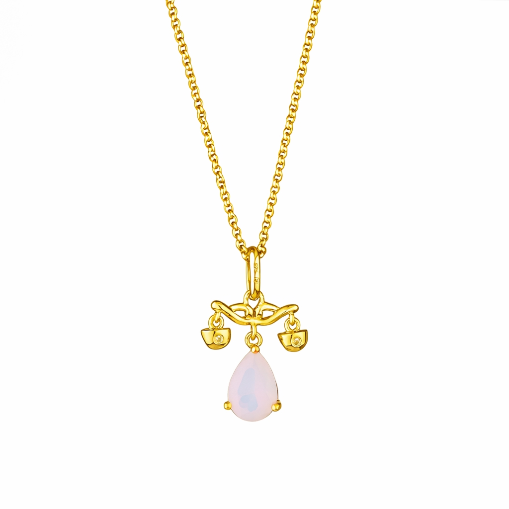 Сребърно колие със зодиакалния знак Везни е изработено от сребро 925 с покритие от 14 карата жълто злато. В центъра му е поставен капковиден розов синтетичен опал с мек, бял нюанс, който придава нежност и изтънченост.
