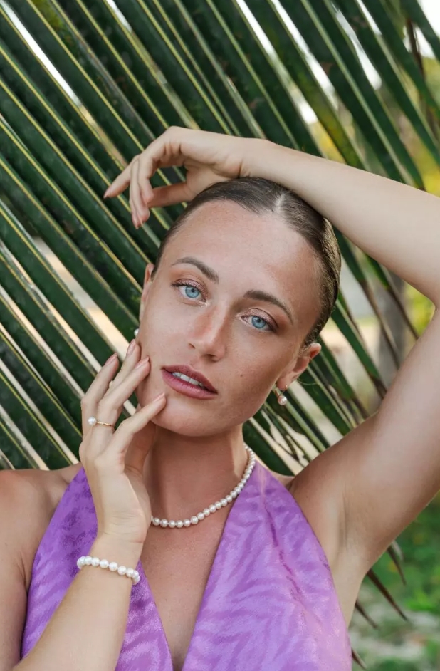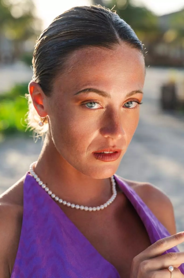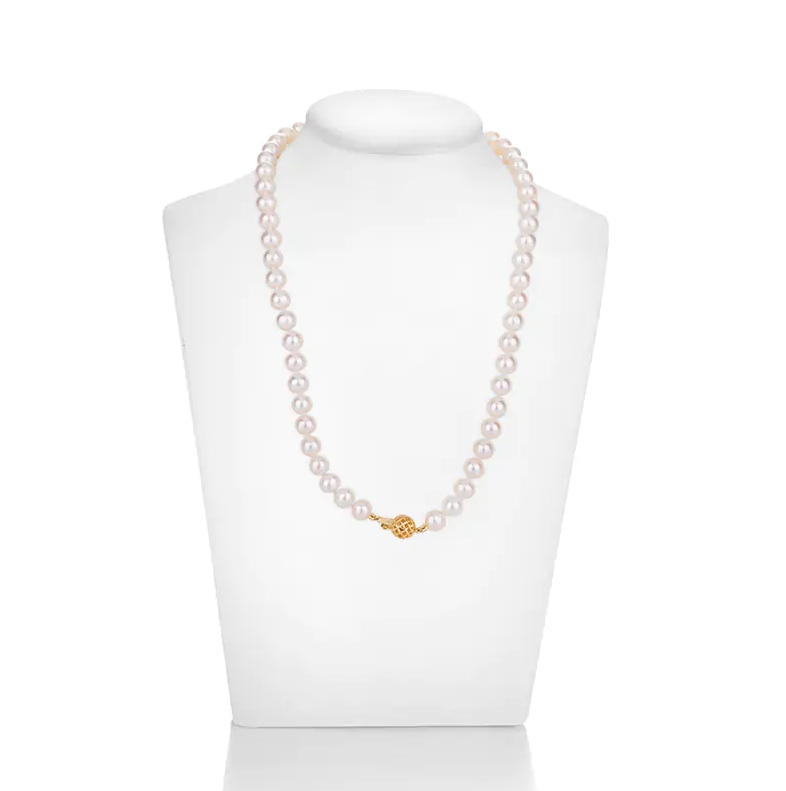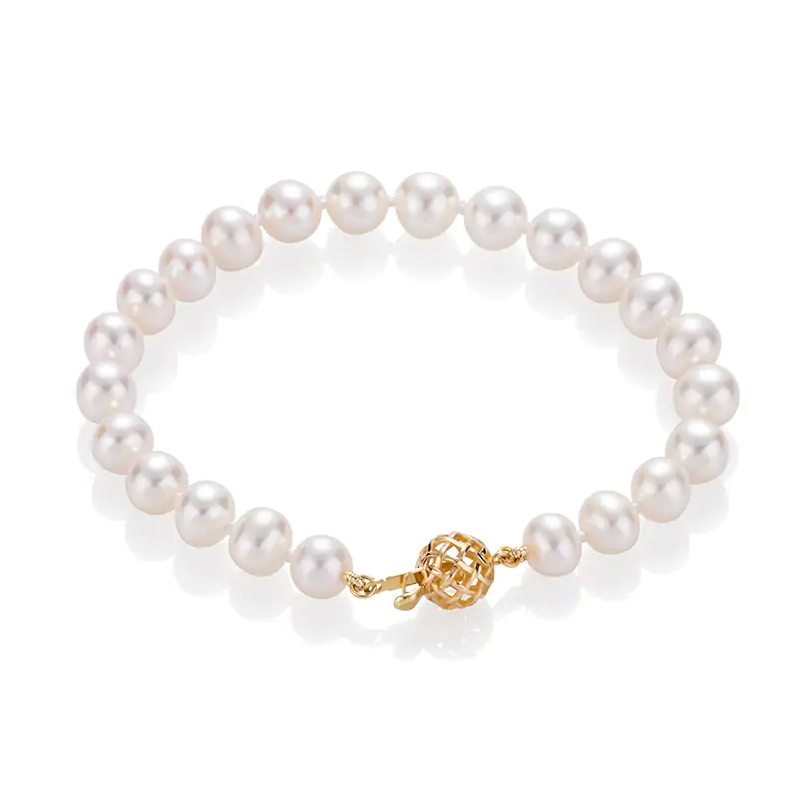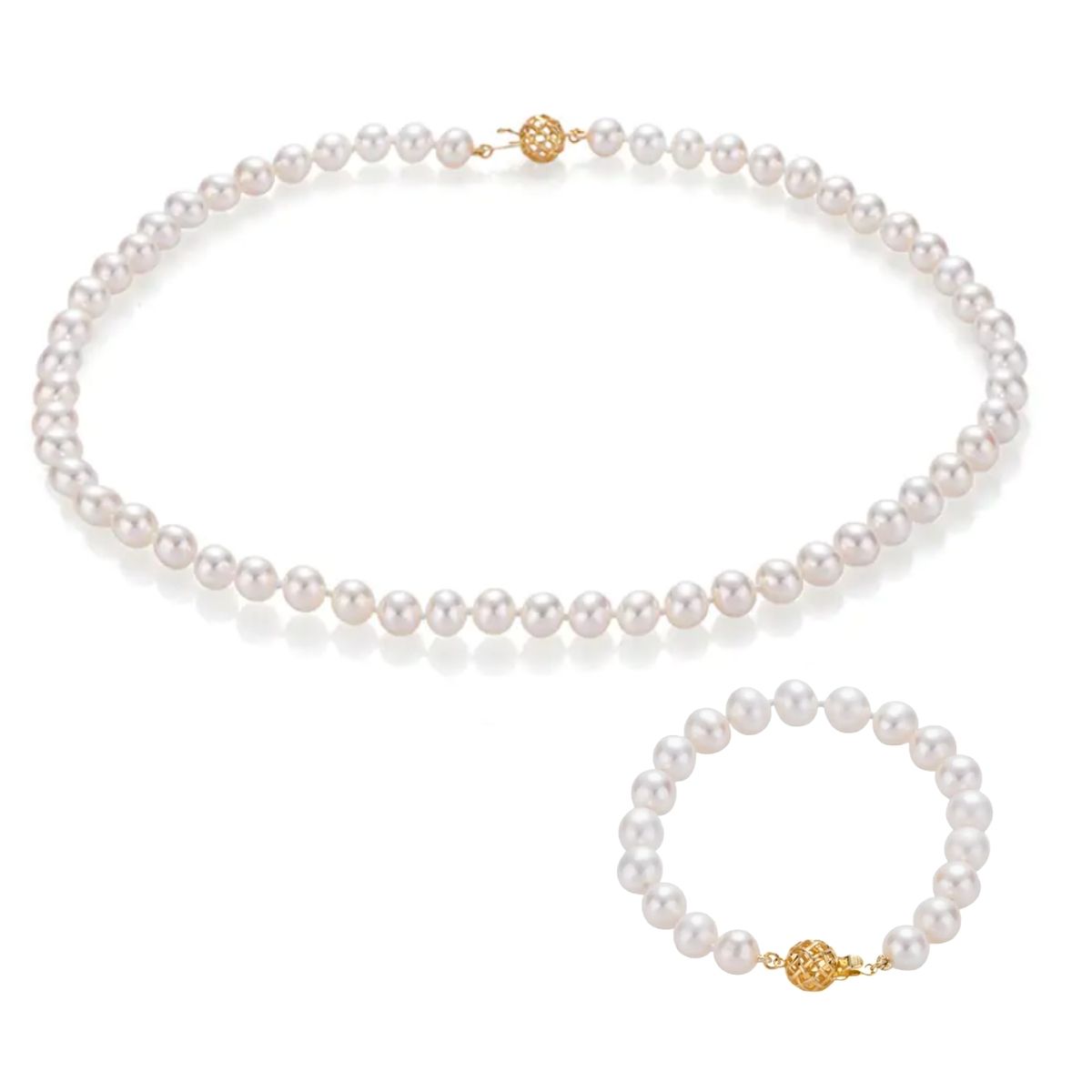 Комплект от гривна и огърлица с бели сладководни перли с много високо качество, отличаващи се с изключително кръглата си форма и блясък. Закопчалката е изработена от 14 карата жълто злато и осигурява стабилно поставяне.
