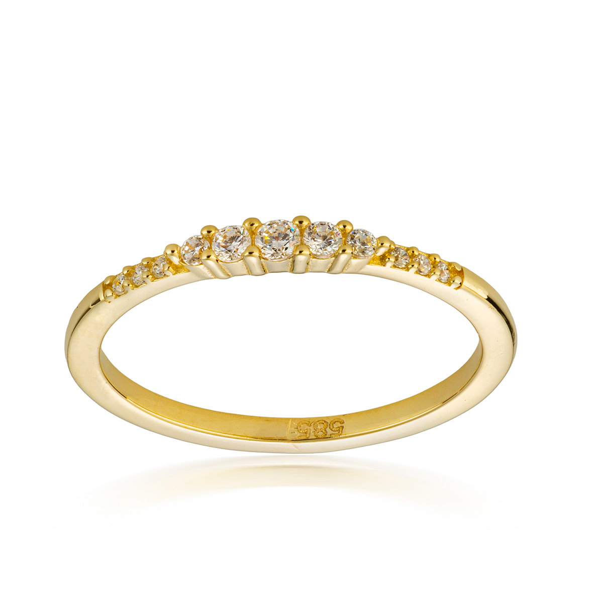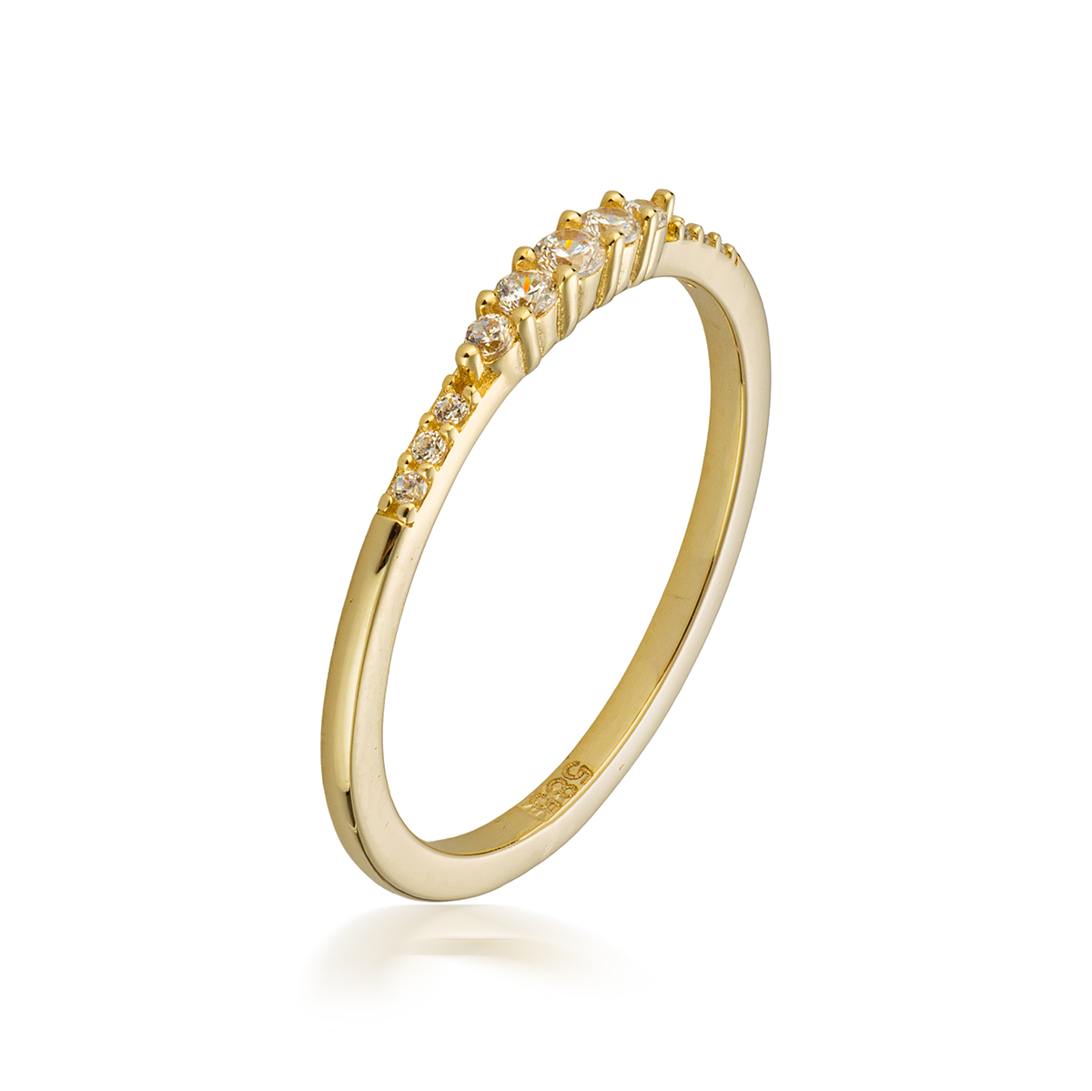 Този изящен пръстен впечатлява с деликатната си, тънка линия и красиво подредените циркониеви камъни, които озаряват горната част на бижуто. Всеки камък улавя светлината по изключително елегантен начин, създавайки фин, но забележим блясък. Дизайнът е изчистен, женствен и модерен — перфектен за жени, които предпочитат стилни, но ненатрапчиви акценти.