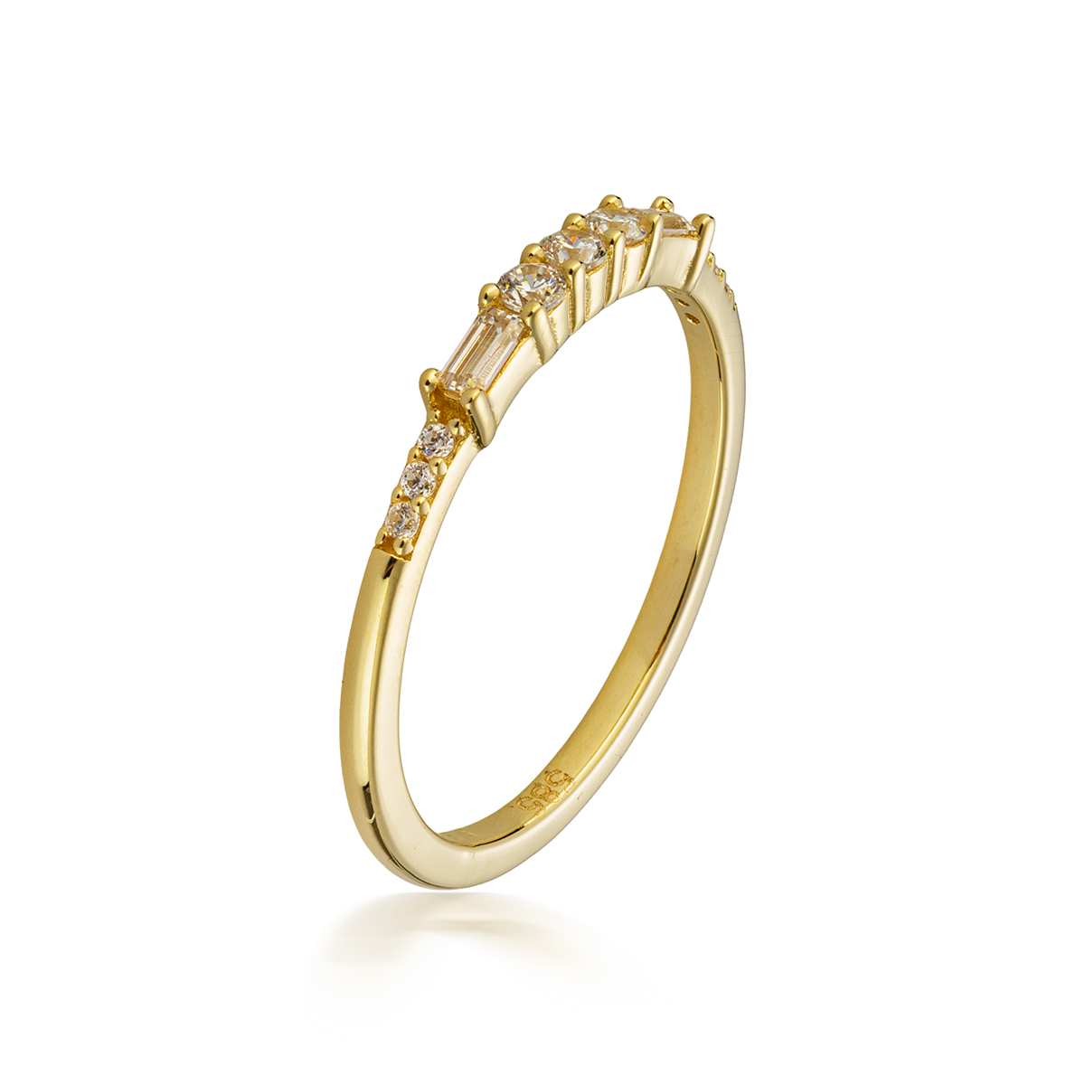 Този изящен пръстен впечатлява с деликатната си, тънка линия и красиво подредените циркониеви камъни, които озаряват горната част на бижуто. Всеки камък улавя светлината по изключително елегантен начин, създавайки фин, но забележим блясък. Дизайнът е изчистен, женствен и модерен — перфектен за жени, които предпочитат стилни, но ненатрапчиви акценти.