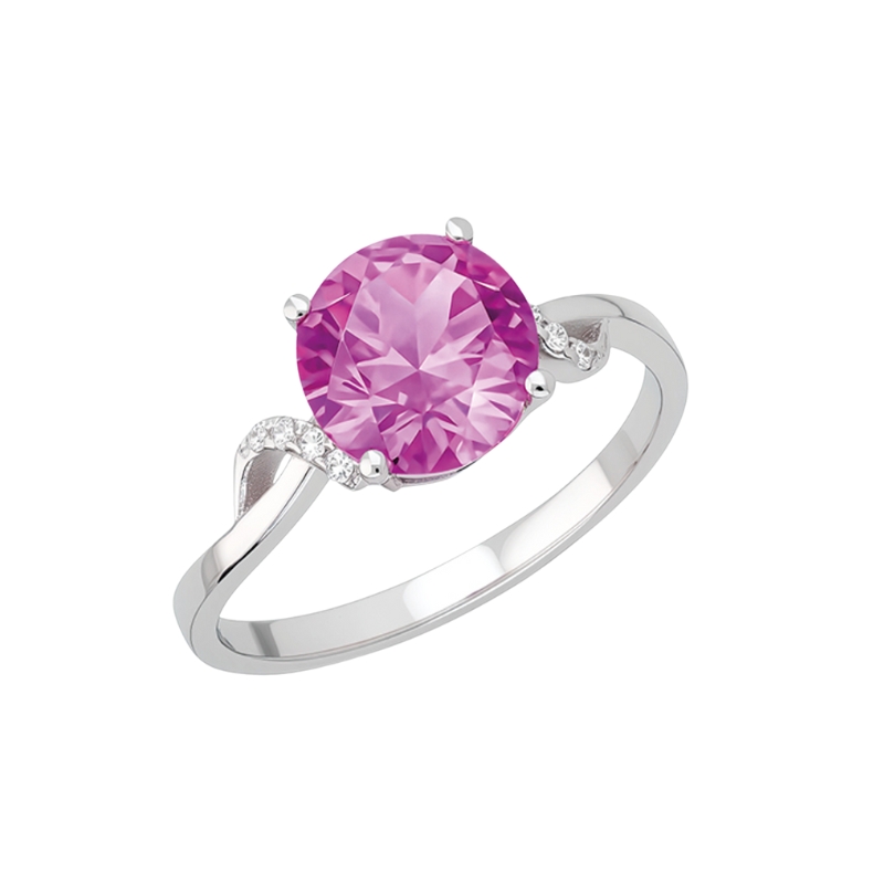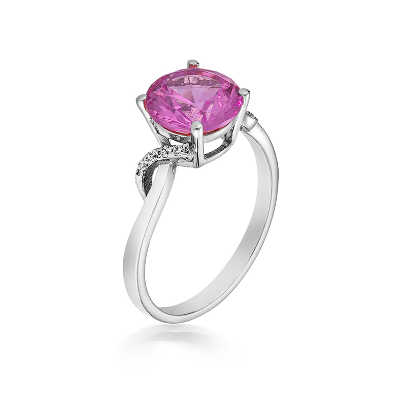 Този златен пръстен е олицетворение на елегантността, съчетавайки блясъка на бялото злато с класическите линии на нежния дизайн. На колието е инкрустиран висококачествен розов цирконий с прецизно шлифовка, чрез която се отразява светлината във всички посоки и се придава дълбочина на цвета. Благодарение на майсторската изработка, камъкът е фиксиран по начин, който подчертава неговия обем, без да натежава на общата композиция. Нежните извивки на пръстена дискретно наподобява символа на безкрайността.