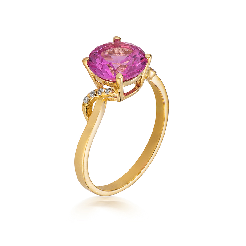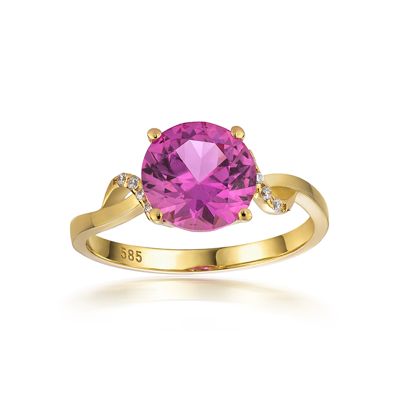Този златен пръстен е олицетворение на елегантността, съчетавайки блясъка на жълто злато с класическите линии на нежния дизайн. На колието е инкрустиран висококачествен розов цирконий с прецизно шлифовка, чрез която се отразява светлината във всички посоки и се придава дълбочина на цвета. Благодарение на майсторската изработка, камъкът е фиксиран по начин, който подчертава неговия обем, без да натежава на общата композиция. Нежните извивки на пръстена дискретно наподобява символа на безкрайността.