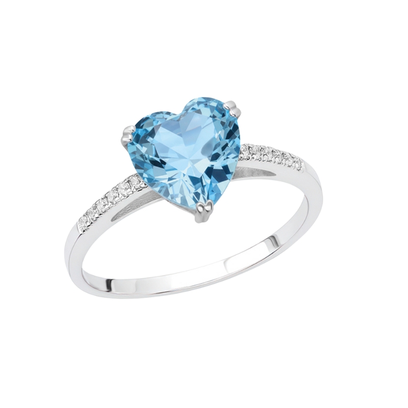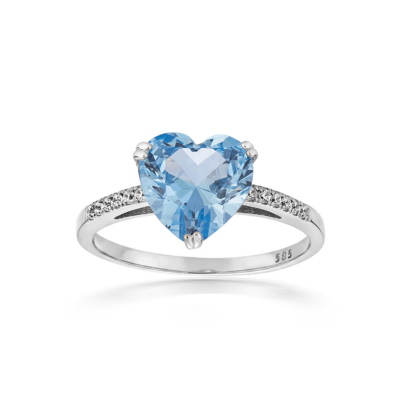 Този златен пръстен е създаден да подчертае романтиката и финеса, съчетавайки класическия блясък на бялото злато с нежен цветен акцент. В центъра на дизайна е инкрустиран висококачествен небесносин цирконий във форма на сърце с прецизна шлифовка, която улавя светлината и разкрива дълбочината на цвета. Камъкът е елегантно фиксиран с фини златни захвати, подчертаващи неговата форма и блясък. Пръстенът носи усещане за нежност, любов и вечна елегантност.