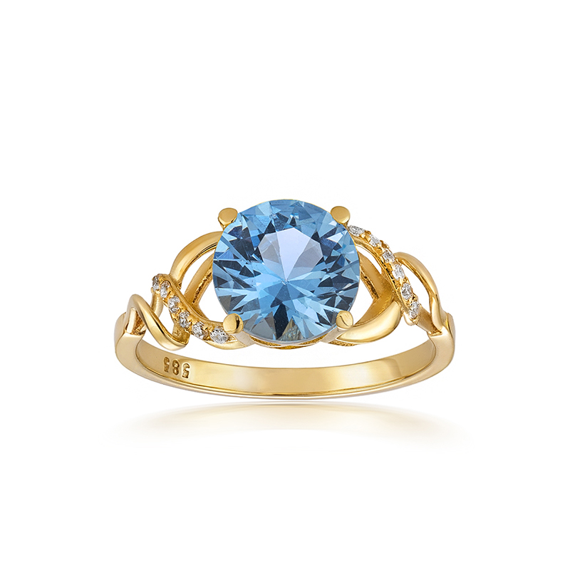 Този златен пръстен е олицетворение на елегантността, съчетавайки блясъка на жълтото злато с класическите линии на нежния дизайн. На пръстена е инкрустиран висококачествен със син цирконий с прецизно шлифовка, чрез която се отразява светлината във всички посоки и се придава дълбочина на цвета. Благодарение на майсторската изработка, камъкът е фиксиран по начин, който подчертава неговия обем, без да натежава на общата композиция. Нежните извивки на пръстена дискретно наподобява символа на безкрайността.