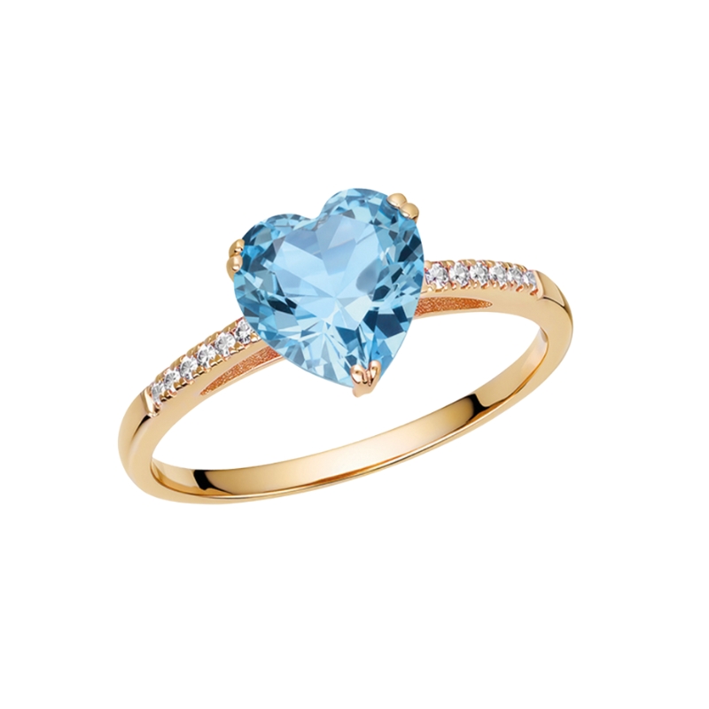 Този златен пръстен е създаден да подчертае романтиката и финеса, съчетавайки класическия блясък на жълтото злато с нежен цветен акцент. В центъра на дизайна е инкрустиран висококачествен небесносин цирконий във форма на сърце с прецизна шлифовка, която улавя светлината и разкрива дълбочината на цвета. Камъкът е елегантно фиксиран с фини златни захвати, подчертаващи неговата форма и блясък. Пръстенът носи усещане за нежност, любов и вечна елегантност.