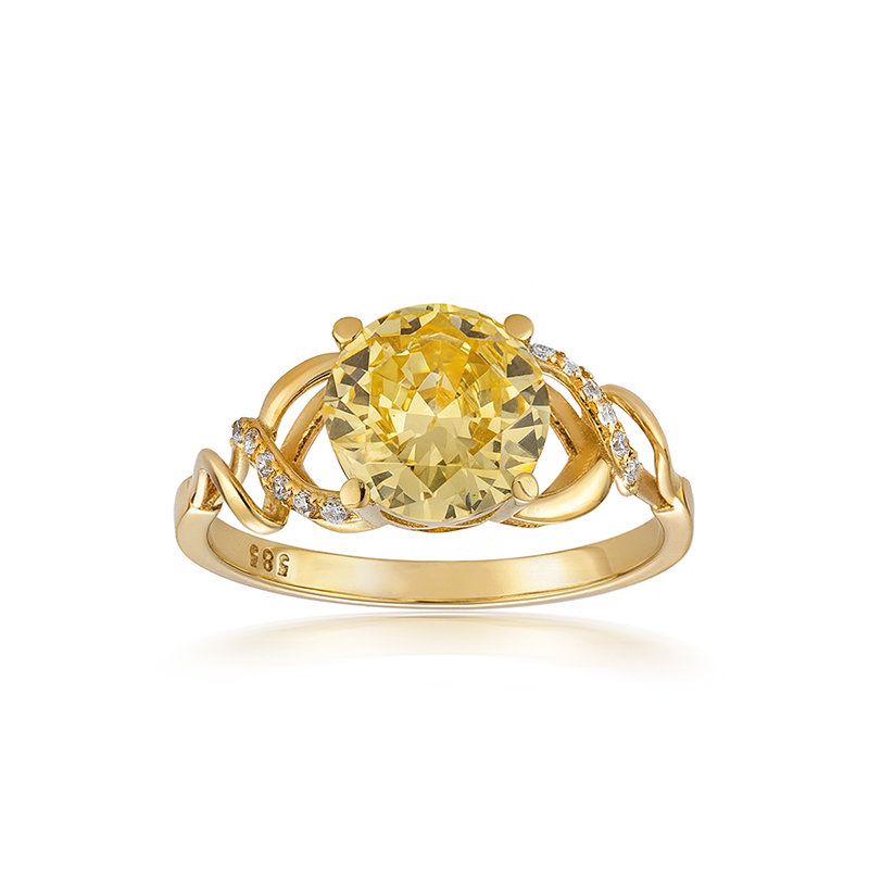 Този златен пръстен е олицетворение на елегантността, съчетавайки блясъка на жълтото злато с класическите линии на нежния дизайн. На колието е инкрустиран висококачествен със синтетичен цитрин с прецизно шлифовка, чрез която се отразява светлината във всички посоки и се придава дълбочина на цвета. Благодарение на майсторската изработка, камъкът е фиксиран по начин, който подчертава неговия обем, без да натежава на общата композиция. Нежните извивки на пръстена дискретно наподобява символа на безкрайността.