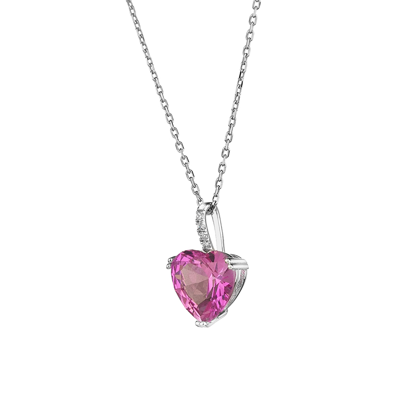Това златно колие е създадено да подчертае романтиката и финеса, съчетавайки класическия блясък на бялото злато с мек нежен цветен акцент. В центъра на висулката е инкрустиран висококачествен розов цирконий във форма на сърце с прецизна шлифовка, която улавя светлината и разкрива дълбочината на цвета. Окачването към синджира е деликатно и са поставени цирконий, които придават допълнителна изисканост и завършеност на дизайна. Колието носи усещане за нежност, любов и вечна елегантност.