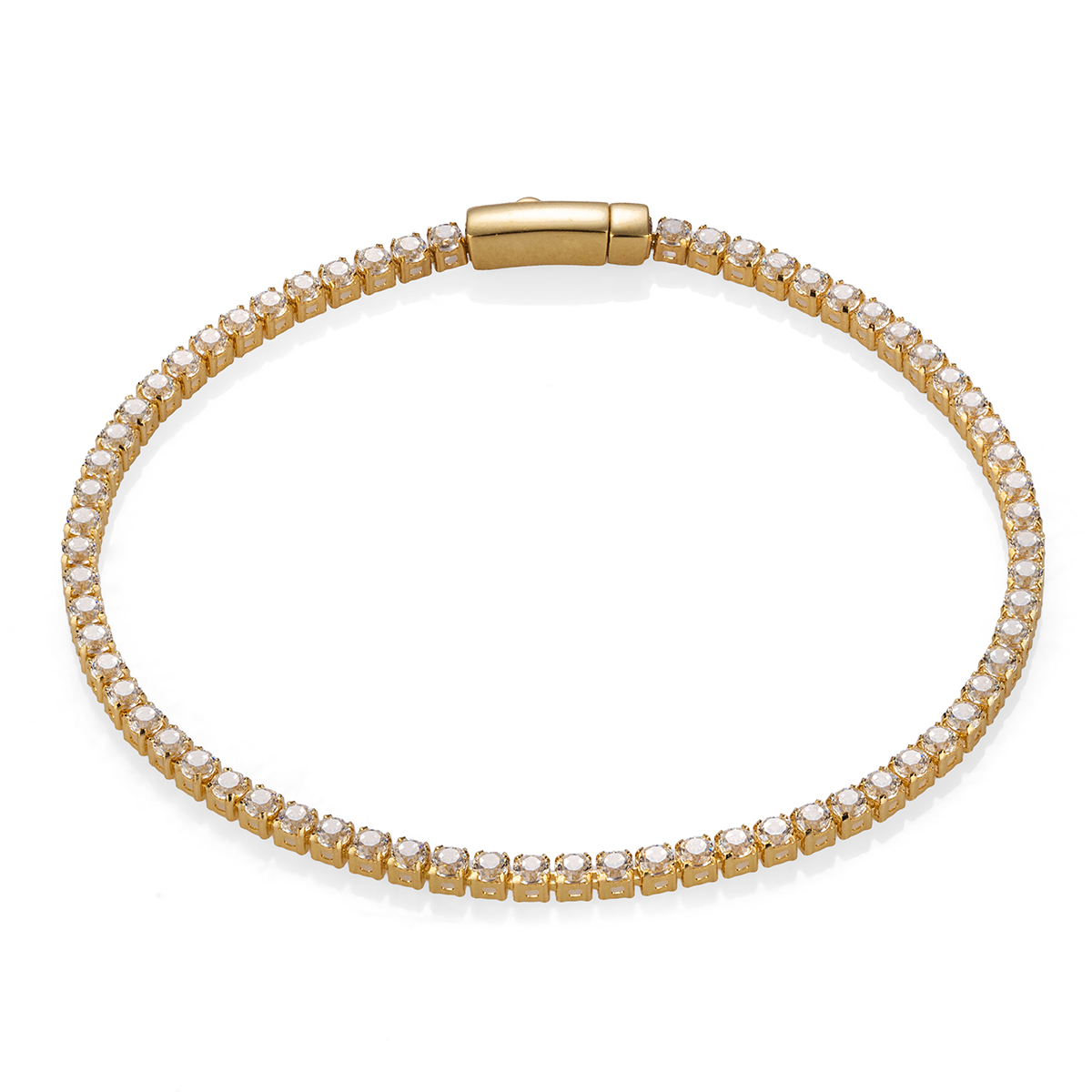 Тази изискана златна тенис гривна е истинско въплъщение на елегантност и безупречен стил. Прецизно подредените блестящи циркониеви камъчета с размер 1.10 мм създават магнетично сияние, което улавя светлината при всяко движение.