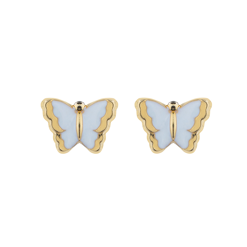 Нежни и деликатни златни обеци с малки пеперуди, които ръчно са изрисувани с бели крила.