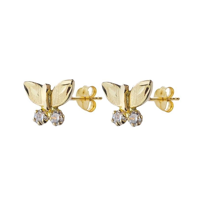 Нежни и деликатни златни обеци с малки пеперуди, на които ръчно са инкрустирани бели и златни циркониеви камъчета.