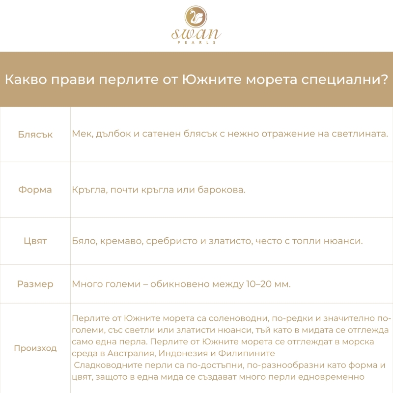 Всяка южноморска перла носи историята на океана, в който е създадена. Тя може да се формира само в напълно чиста морска среда. Всяка промяна в екосистемата се отразява върху нейната повърхност – затова перлата е жива следа от времето, водата и грижата, които е получила.