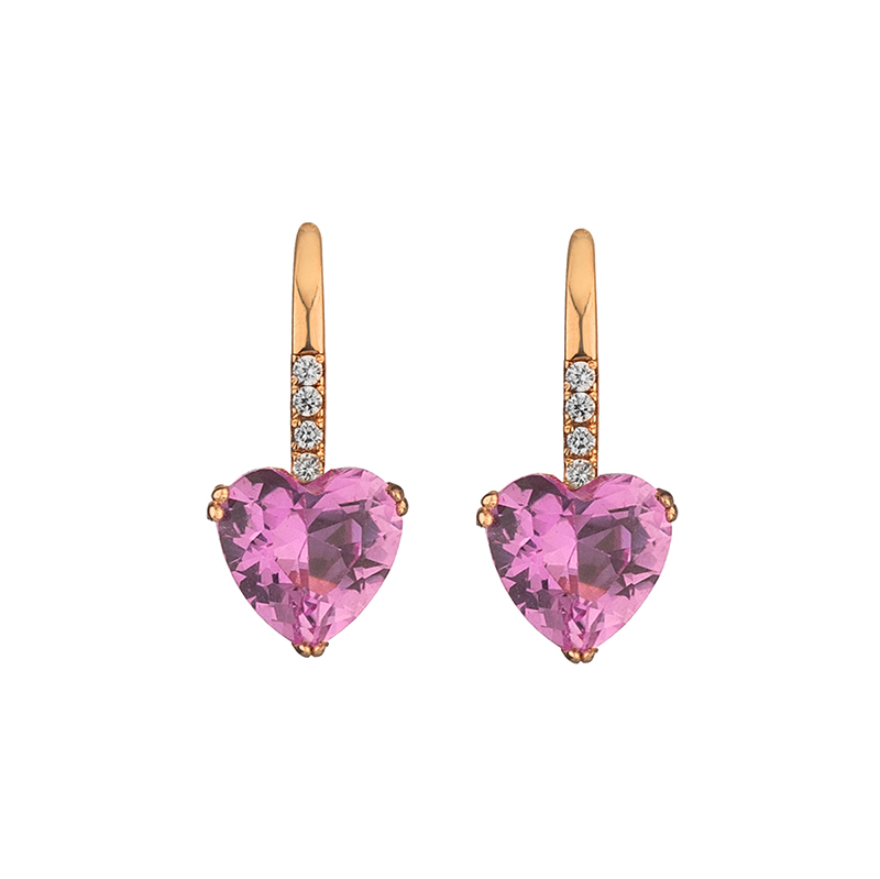 Тези златни обеци са създадени да подчертаят романтиката и финеса, съчетавайки класическия блясък на розовото злато с мек нежен розов акцент. В центъра на всяка обеца е инкрустиран висококачествен розов цирконий във форма на сърце с прецизна шлифовка, която улавя светлината и разкрива дълбочината на цвета. Камъните са елегантно фиксирани с фини златни захвати, подчертаващи тяхната форма и блясък. Горната част на обеците е деликатно акцентирана с цирконий, които придават допълнителна изисканост и завършеност на дизайна. Обеците носят усещане за нежност, любов и вечна елегантност.