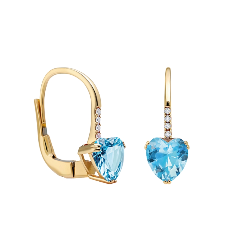 Тези златни обеци са създадени да подчертаят романтиката и финеса, съчетавайки класическия блясък на жълтото злато с мек нежен розов акцент. В центъра на всяка обеца е инкрустиран висококачествен небесносин цирконий във форма на сърце с прецизна шлифовка, която улавя светлината и разкрива дълбочината на цвета. Камъните са елегантно фиксирани с фини златни захвати, подчертаващи тяхната форма и блясък. Горната част на обеците е деликатно акцентирана с цирконий, които придават допълнителна изисканост и завършеност на дизайна. Обеците носят усещане за нежност, любов и вечна елегантност.