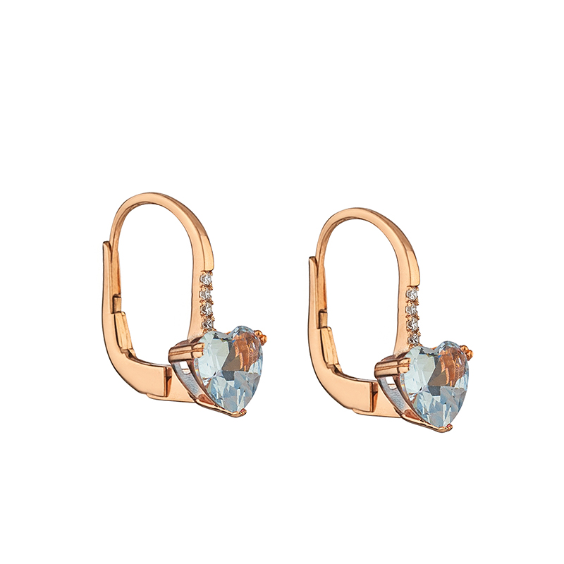 Тези златни обеци са създадени да подчертаят романтиката и финеса, съчетавайки класическия блясък на розовото злато с мек нежен розов акцент. В центъра на всяка обеца е инкрустиран висококачествен небесносин цирконий във форма на сърце с прецизна шлифовка, която улавя светлината и разкрива дълбочината на цвета. Камъните са елегантно фиксирани с фини златни захвати, подчертаващи тяхната форма и блясък. Горната част на обеците е деликатно акцентирана с цирконий, които придават допълнителна изисканост и завършеност на дизайна. Обеците носят усещане за нежност, любов и вечна елегантност.