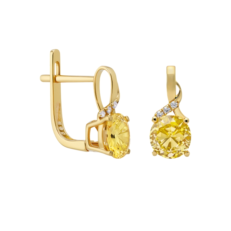 Тези златни обеци са олицетворение на елегантността, съчетавайки блясъка на жълтото злато с класическите линии на нежния дизайн. На обеците са инкрустирани висококачествен синтетичен цитрин с прецизна шлифовка, чрез която се отразява светлината във всички посоки. Благодарение на майсторската изработка, камъкът е фиксиран по начин, който подчертава неговия обем, без да натежава на общата композиция. Нежните извивки на обеците дискретно наподобява символа на безкрайността.
