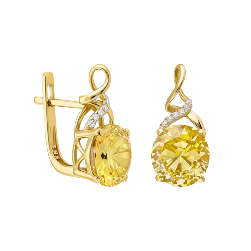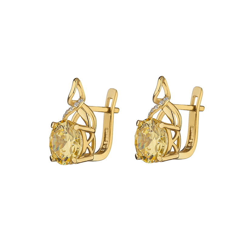 Тези златни обеци са олицетворение на елегантността, съчетавайки блясъка на жълтото злато с класическите линии на нежния дизайн. В центъра на всяка обеца е инкрустиран висококачествен синтетичен цитрин с прецизна кръгла шлифовка, която улавя и отразява светлината във всички посоки, придавайки наситеност и дълбочина на цвета. Благодарение на майсторската изработка, камъните са стабилно фиксирани с фини златни захвати, които подчертават техния обем и блясък. Изящните извивки в горната част на обеците, допълнени с деликатни камъни, дискретно наподобяват символа на безкрайността и придават завършен, изтънчен акцент на бижуто.