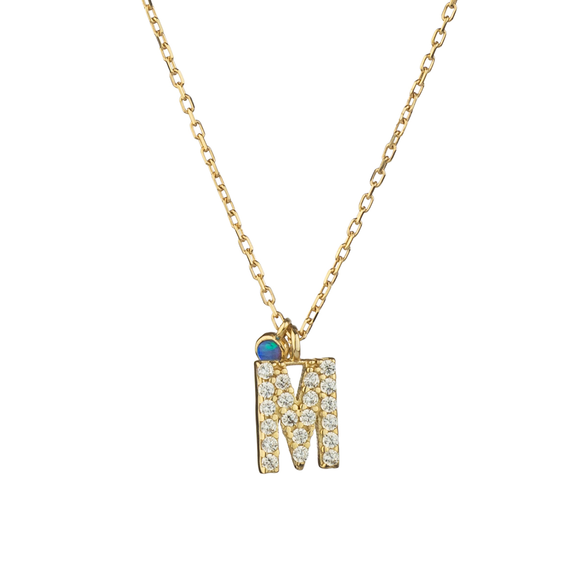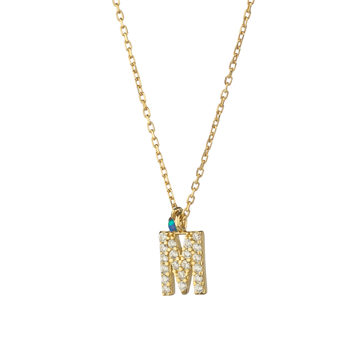 Това изящно златно колие с буква „M“ впечатлява с баланса си между персонален символ и фин блясък. Обсипано с деликатни циркониеви камъчета, то улавя светлината по нежен, елегантен начин и добавя стилен акцент към всяка визия.