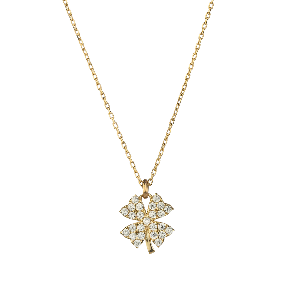 Това изящно златно колие с детелина е символ на късмет, нежност и женственост. Всяко от четирите листенца е внимателно инкрустирано с блестящи циркониеви камъни, които улавят светлината и създават красиво, сияйно излъчване. Дизайнът е едновременно фин и впечатляващ — перфектен за жени, които обичат бижута с послание.