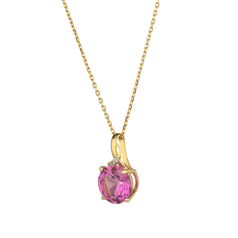 Това златно колие е олицетворение на елегантността, съчетавайки блясъка на жълтото злато с класическите линии на нежния дизайн. На колието е инкрустиран висококачествен розов цирконий с прецизно шлифовка, чрез която се отразява светлината във всички посоки и се придава дълбочина на цвета. Благодарение на майсторската изработка, камъкът е фиксиран по начин, който подчертава неговия обем, без да натежава на общата композиция. Нежните извивки на висулката дискретно наподобява символа на безкрайността.
