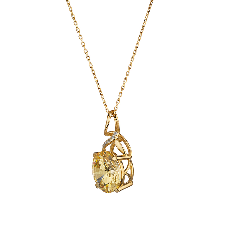 Това златно колие е олицетворение на елегантността, съчетавайки блясъка на жълтото злато с класическите линии на нежния дизайн. В центъра на висулката е инкрустиран висококачествен синтетичен цитрин с прецизна кръгла шлифовка, която улавя и отразява светлината във всички посоки, придавайки наситеност и дълбочина на цвета. Благодарение на майсторската изработка, камъкът е стабилно фиксиран с фини златни захвати, които подчертават неговия обем и блясък. Изящната извивка на окачването, допълнена с деликатни цирконий, дискретно наподобява символа на безкрайността и придава завършеност и изтънчен акцент на бижуто.
