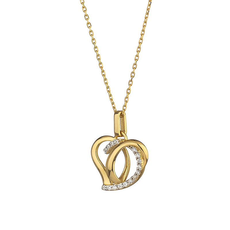 Това златно колие е израз на нежност и емоция, съчетавайки топлия блясък на жълтото злато с изящни, плавни линии. Висулката е оформена от преплетени сърцевидни елементи, които символизират любовта. Част от формите са деликатно инкрустирани с висококачествен цирконий с прецизна шлифовка, чрез която се отразява светлината във всички посоки. Благодарение на прецизната изработка, всеки детайл е хармонично балансиран, а композицията наподобява движение и непрекъснатост.